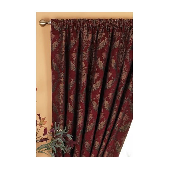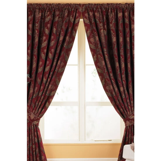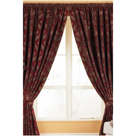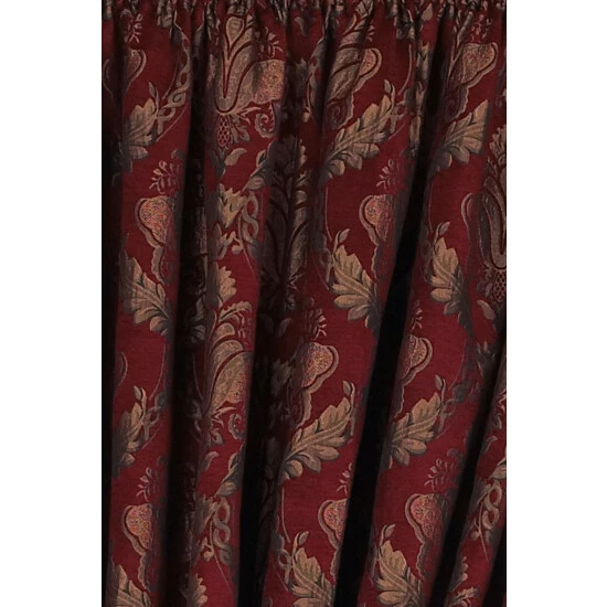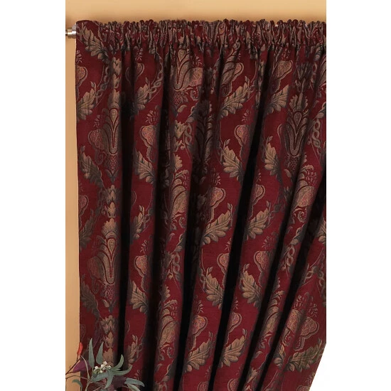 The Shiraz range is the height of opulence. Each piece has an embroidered damask pattern in delicate gold, presented on burgundy red, chenille-style fabric. The Shiraz pencil pleat curtains are the ideal addition to a traditional home interior. The thick fabric gives these luxurious curtains room darkening properties and include two matching tiebacks with stainless steel rings.