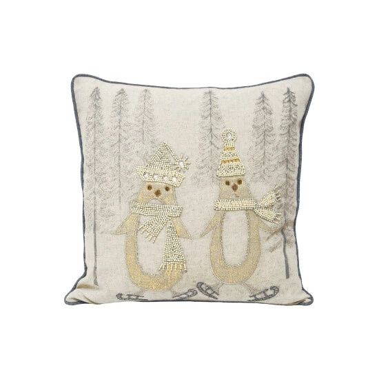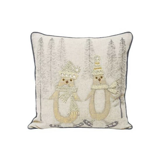 Whether you prefer traditional Christmas themed interiors or a more modern take the Advent cushion cover has you covered. With a linen style front beautifully adorned with hundreds of sequins and beads it adds a glam twist on conventional holiday themed cushions. The Skating Penguin cushion cover features two adorable penguins testing out their skates together. Complete with silver piped edges and a hidden zip closure for an extra touch of luxury. Made of 100% flax linen face and a faux silk polyester reverse you grey a mashup of old and new. Due to this cushion’s opulent embellishments spot clean only. Do not iron and lay flat to dry for the best results.