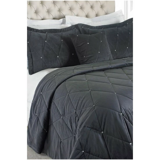 Give your room a soothing sparkle with the New Diamante bed runner. Featuring a delicate diamond stitched design on luxurious faux velvet fabric, the quilted detailing works ideally with bedrooms and living rooms and is sure to complement an array of both traditional and contemporary interiors. Possibly the most notable aspect of this opulent runner is the embroidered diamante crystals that are lovingly stitched into each corner of the diamond design. Crafted from a sumptuous 100% polyester fabric this bed runner feels as good as it looks while also being hard-wearing. Specifically made to match the New Diamante bedspread set and cushion covers. Treat this runner with the utmost care and dry clean only.
