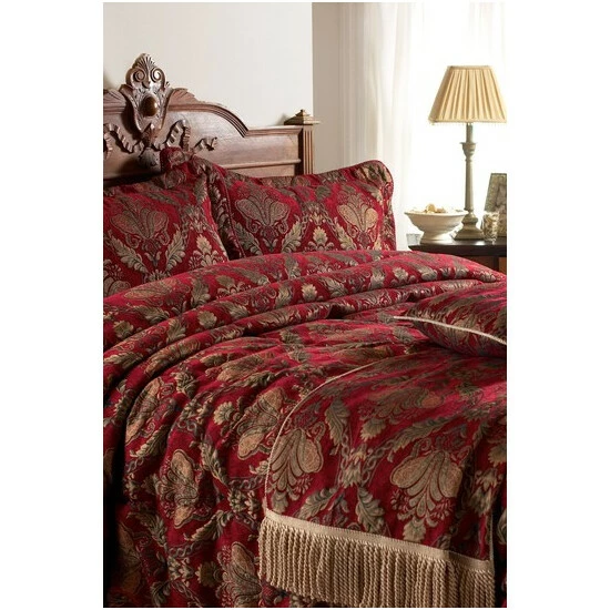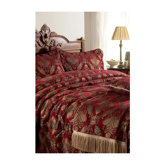The Shiraz range is the height of opulence. Each piece has an embroidered damask pattern in delicate gold, presented on burgundy red, chenille-style fabric. Complete your bedspread with this gorgeous throw. The Shiraz throw is lined with gold fabric and features twisted fringing on either side. Specifically designed to match the Shiraz bedspread and pillow sham. This luxurious throw must be treated carefully and is only appropriate to dry clean.