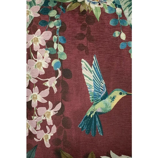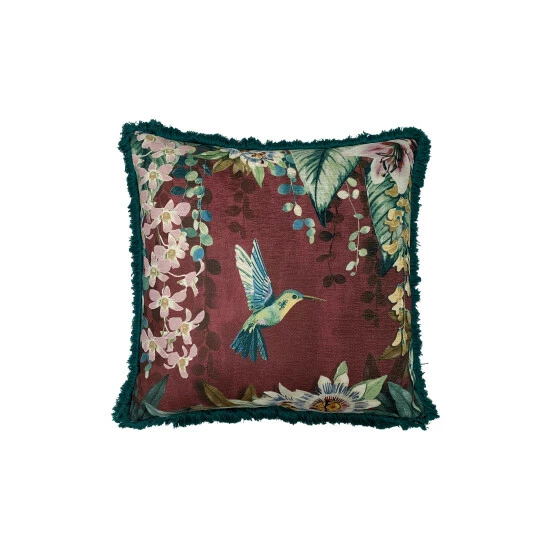 A tranquil and romantic design, the Hanging Garden cushion features delicate hummingbirds fluttering between cascading lily, orchid and passion flower. A soft and textural chenille front is paired with a stylish and beautifully silky fringed trim in a rich teal, complementing the opulent aubergine base colour of the exotic design.